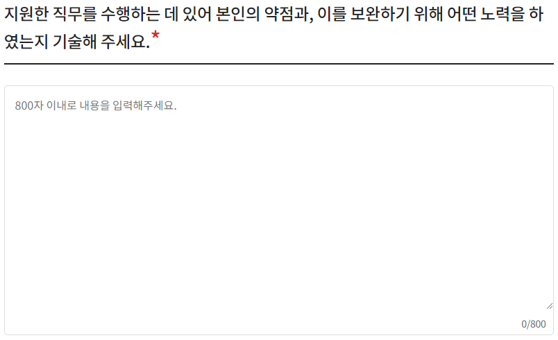 ● 지원한 직무를 수행하는 데 있어 본인의 약점과, 이를 보완하기 위해 어떤 노력을 하였는지 기술해 주세요. (800자 이내)