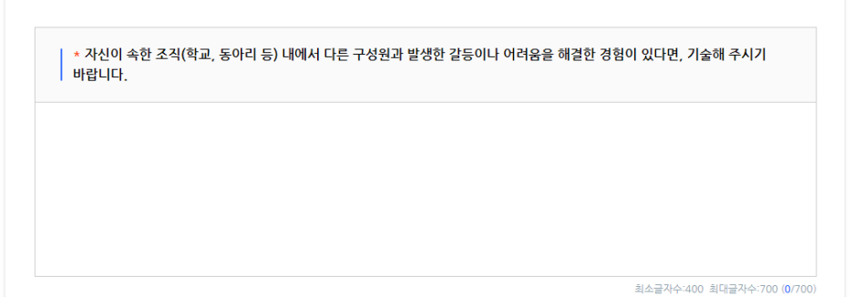 * 자신이 속한 조직(학교, 동아리 등) 내에서 다른 구성원과 발생한 갈등이나 어려움을 해결한 경험이 있다면, 기술해 주시기 바랍니다. (최대 700자)