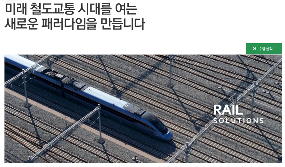 철도사업은 국내를 넘어 세계 38개국에 전동차, 고속전철, 경전철, 디젤동차, 기관차 및 객/화차 등 다양한 차종의 철도차량을 공급해 왔으며, 철도차량의 핵심 전장품을 독자기술로 국산화하여 열차종합제어관리장치, 견인전동기, 추진제어장치, 보조전원장치 등을 생산하고 있습니다. 최근에는 철도차량 뿐만 아니라 신호, 통신, 전력, PSD 등 철도시스템분야를 비롯해 운영 및 차량 유지보수, 개조, 부품공급 등 철도서비스 분야로 사업영역을 더욱 확대해 나가고 있습니다.