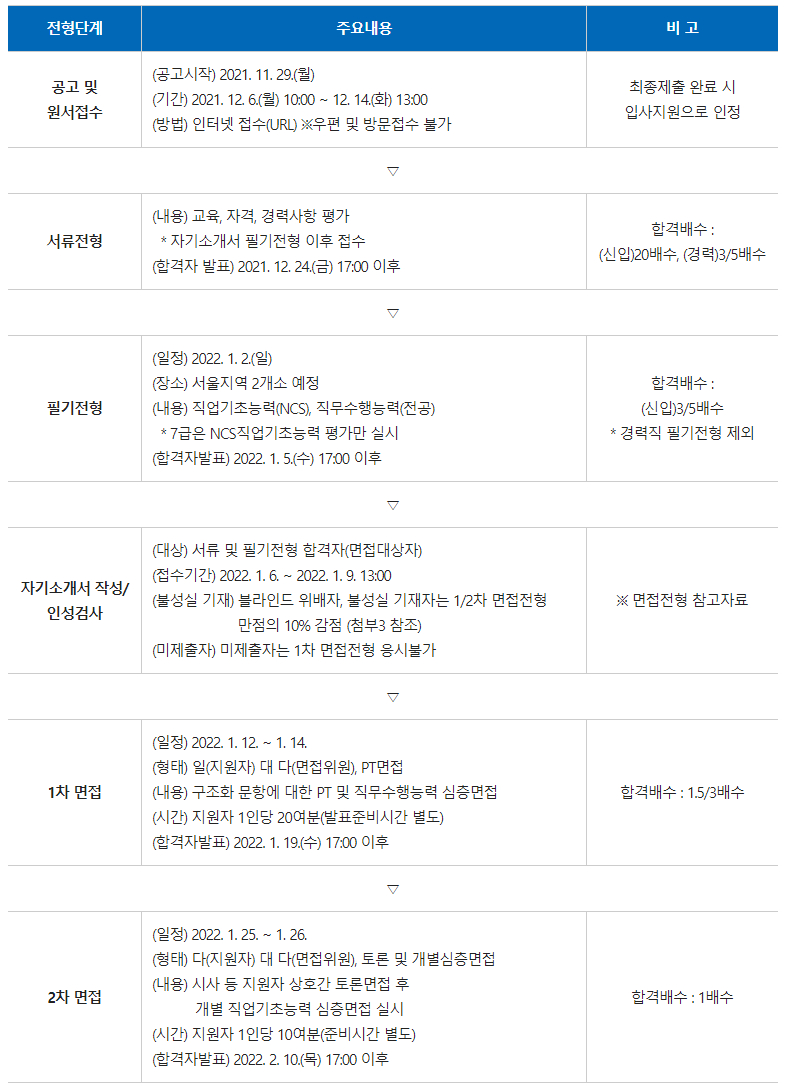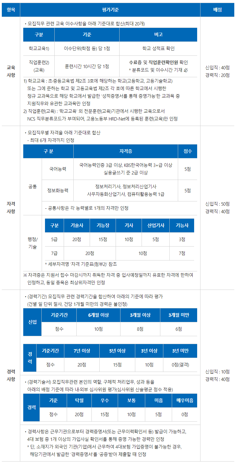 2) 취업지원대상(보훈) 가점은 ‘보훈전형’ 외 ‘모집인원 3명 이하의 모집분야’에서는 모든 전형에서 적용 제외