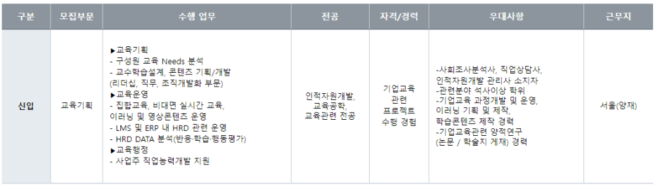 -교육관련 행정업무 : LMS/ERP 운영지원, 교육예산/비용관리 및 분석, 사업주 직업능력개발지원 업무 수행을 위한 행정업무, 어학/자격증 관리 등