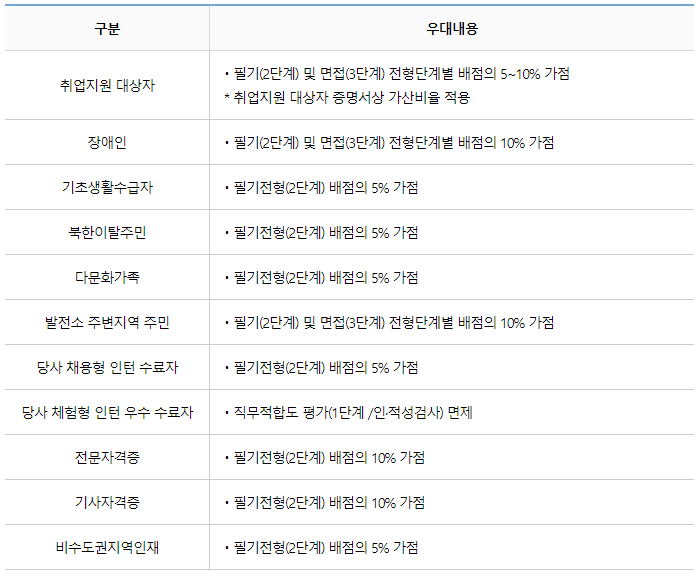 · 필기전형 : 취업지원대상자, 장애인, 직무적합도 평가 우수등급 순 (이후에도 동점자 발생시 전원합격)