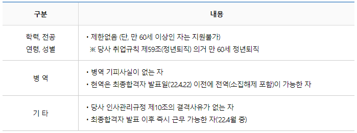 ※ 공개채용에도 응시할 수 있으며, 공개채용에 응시하는 경우에도 보훈대상자는 보훈등급에 따라 5~10% 가점부여 (단, 공개채용과 제한채용에 동시지원 불가)