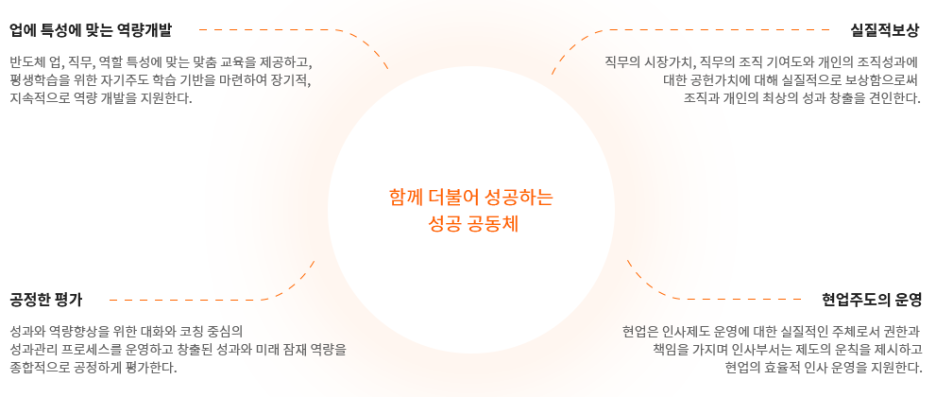 · 기술경쟁력의 의적 의존도가 높은 반도체 사업의 특성을 반영하여 개인의 누적적 연속적 성장을 지원합니다.
