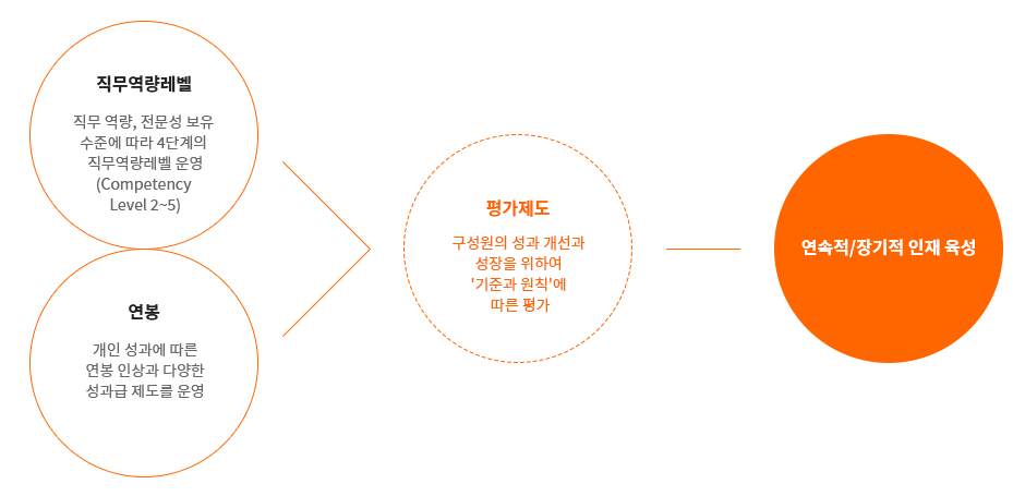 이에 따라 장기적 관점에서 공정한 평가를 통해 인재를 육성하고 있으며, 구성원의 직무 역량 및 전문성 보유 수준,