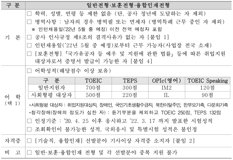 ※ 어학성적, 자격증, 사회형평 대상자 등 모든 자격요건, 평가 및 우대와 관련된 사항은 채용공고 마감일(’22. 3. 17) 까지 취득하고 유효기간 내인 경우에 한하여 인정함