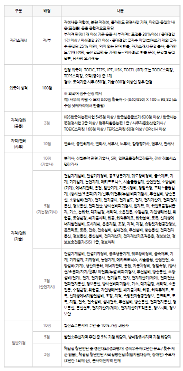※ 어학점수의 경우 최고 득점을 노리기 보다는 만점을 받을 수 있는 점수까지만 준비하시면 되고 기본 자격요건에 해당하는 어학점수를 영어스피킹으로 제출하는 경우 중복으로 인정이 됩니다. 그렇기 때문에 토익을 갖고 있는 지원자는 영어스피킹 점수를 추가로 준비해야 하지만 영어스피킹 점수를 갖고 있는 지원자는 한가지로 해결이 됩니다. (필기시험 가점 추가적용)