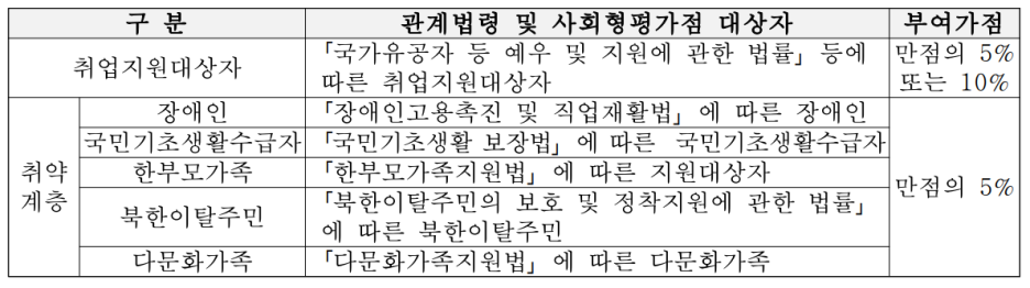 * 사회형평 가점 - 취업지원 대상자(만점의 5%/10%), 취약계층(만점의 5%)