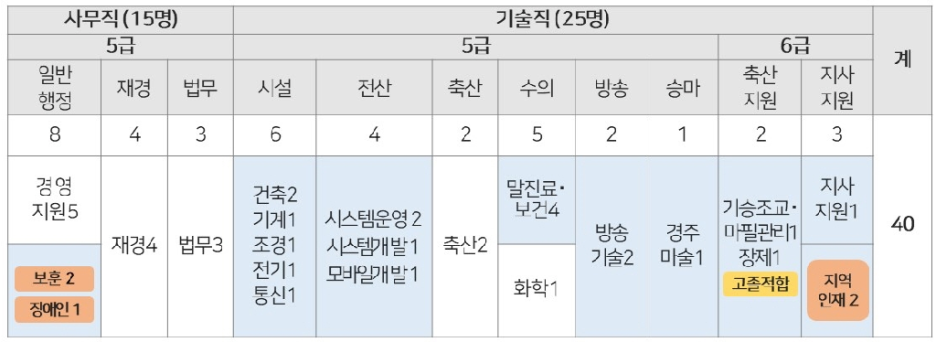 · 취업지원(보훈)대상자에 대한 가점 부여방식은 관련법에 따름(4명 이상 채용분야 및 보훈 제한경쟁에만 적용, 전형별 가점 합격자는 선발예정인원의 30% 초과 불과, 과목별 40%미만 득점자 가점 미적용)