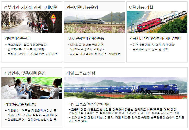 코레일관광개발㈜는 철도와 연계한 관광·승무·유통·테마파크 등의 서비스를 통해 국민 여가생활을 주도하고 있습니다. 국내·외 관광객 2천만명 시대를 대비하여 관광레저 분야의 신사업 개발에 박차를 가하고 있으며, ‘대한민국 1등 관광개발 기업’을 만드는 것을 목표로 합니다.