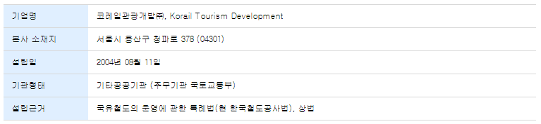 코레일관광개발㈜는 서비스 전문기업으로서, 철도 인프라를 기반으로, 관광여행상품을 만들고, 고품격 서비스를 제공하며, 지자체와 연계사업을 통하여 지역경제, 사회발전에 이바지하는 철도 서비스 전문 기타공공기관 입니다.