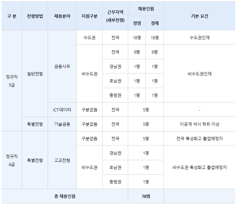 - 일반전형(금융사무) 및 특별전형(고교전형)은 비수도권을 할당하여 구분 전형 실시