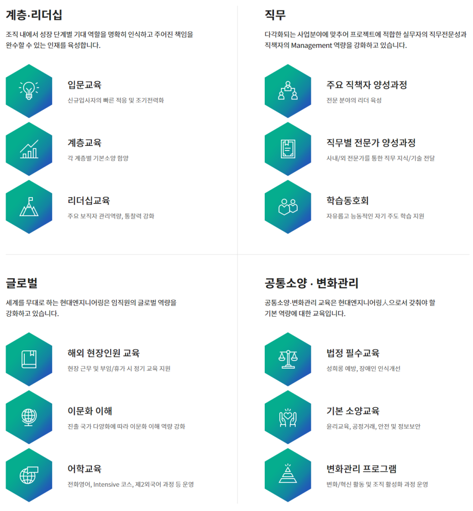 · 사람이 곧 기업이라는 인재육성 방침에 따라 업무 전문가를 양성하고 국제적인 역량을 강화하며 개개인에 적합한 맞춤교육 시행