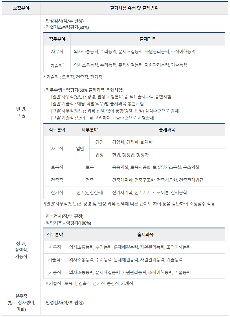 · 직업기초능력 면접(60%) : 인성 등 직업인이 갖추어야 할 기초능력(의사소통, 직업윤리, 조직 적응, 자기개발, 문제 해결) 평가