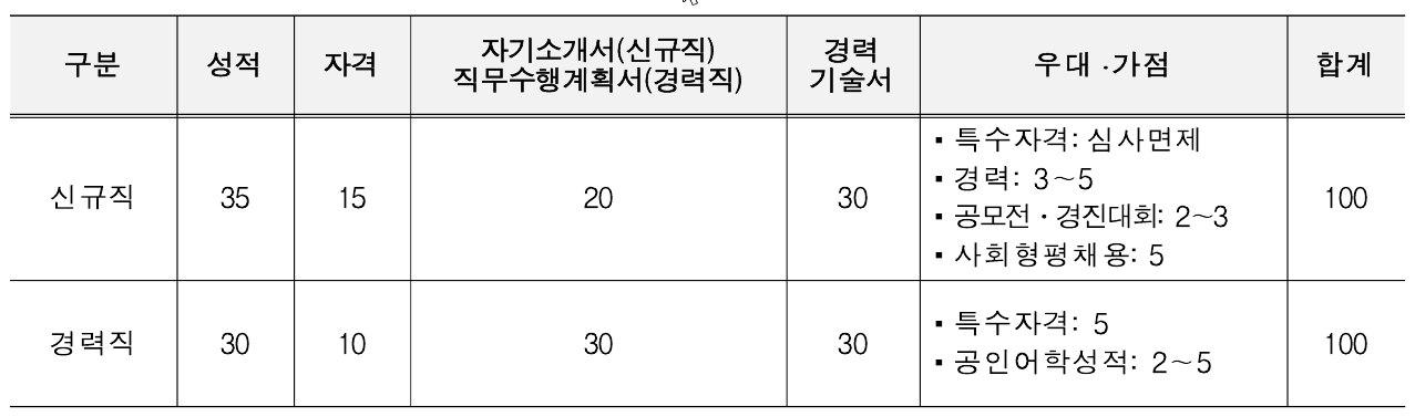 · 국가유공자 등 예우 및 지원에 관한 법률 등 관련 법령에 따라 취업지원대상자는 전형단계별로 만점(가점 제외)의 5∼10% 가산점 부여