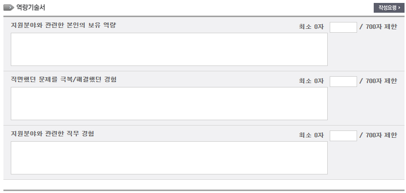 -이 항목은 역량기술서 첫 문항에 있는 직무역량과 관련된 사례에 대해서 작성하시면 됩니다.