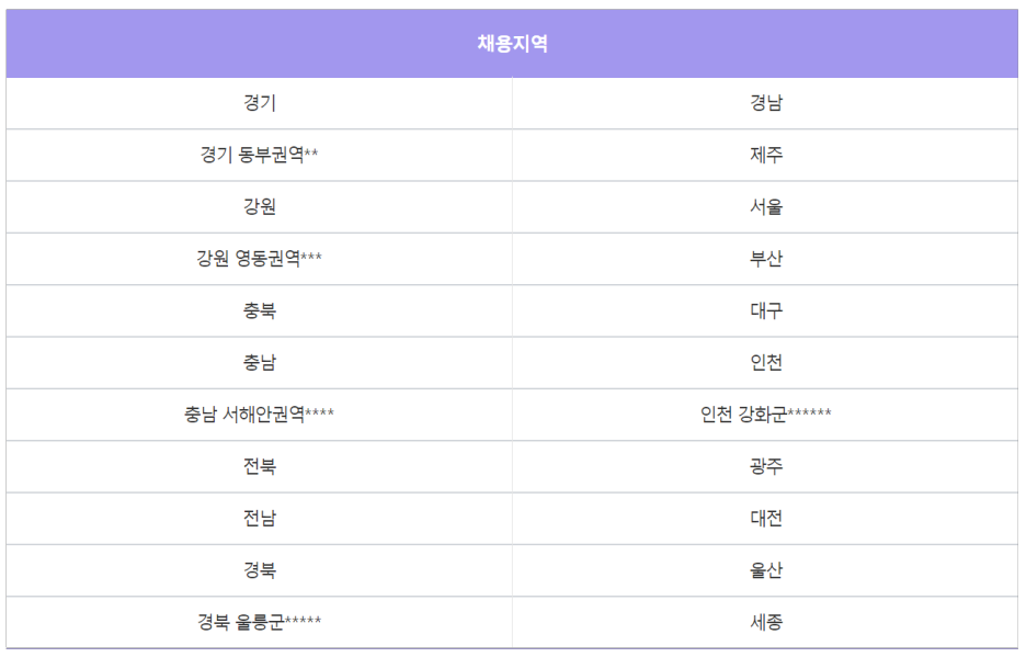 ※ 지원 단위 : 경기, 경기 동부권역, 강원, 강원 영동권역, 충북, 충남, 충남 서해안권역, 전북, 전남, 경북, 경북 울릉군, 경남, 제주, 서울, 부산, 대구, 인천, 인천 강화군, 광주, 대전, 울산, 세종