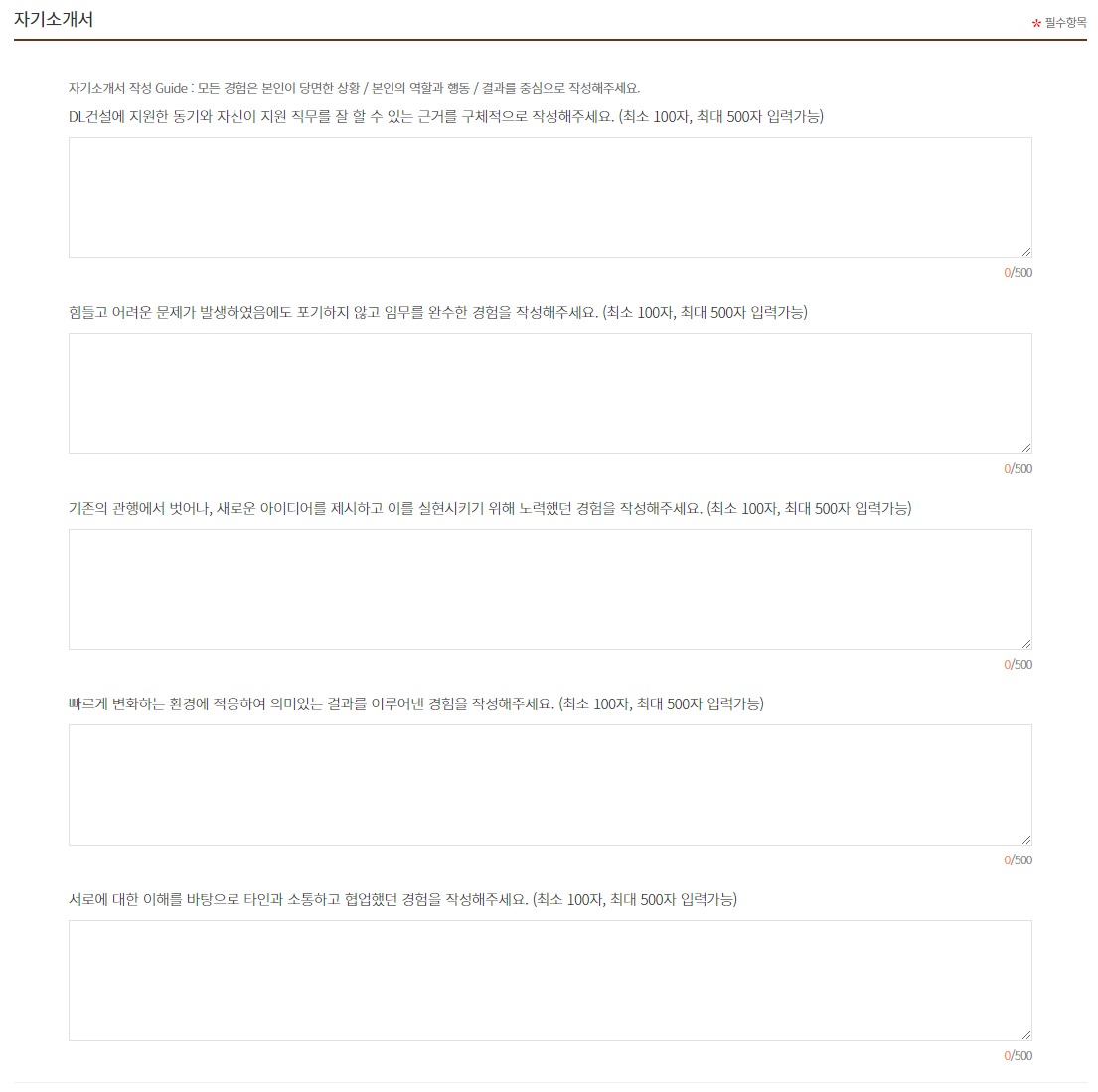 ◎ DL건설에 지원한 동기와 자신이 지원 직무를 잘할 수 있는 근거를 구체적으로 작성해 주세요. (최소 100자, 최대 500자)