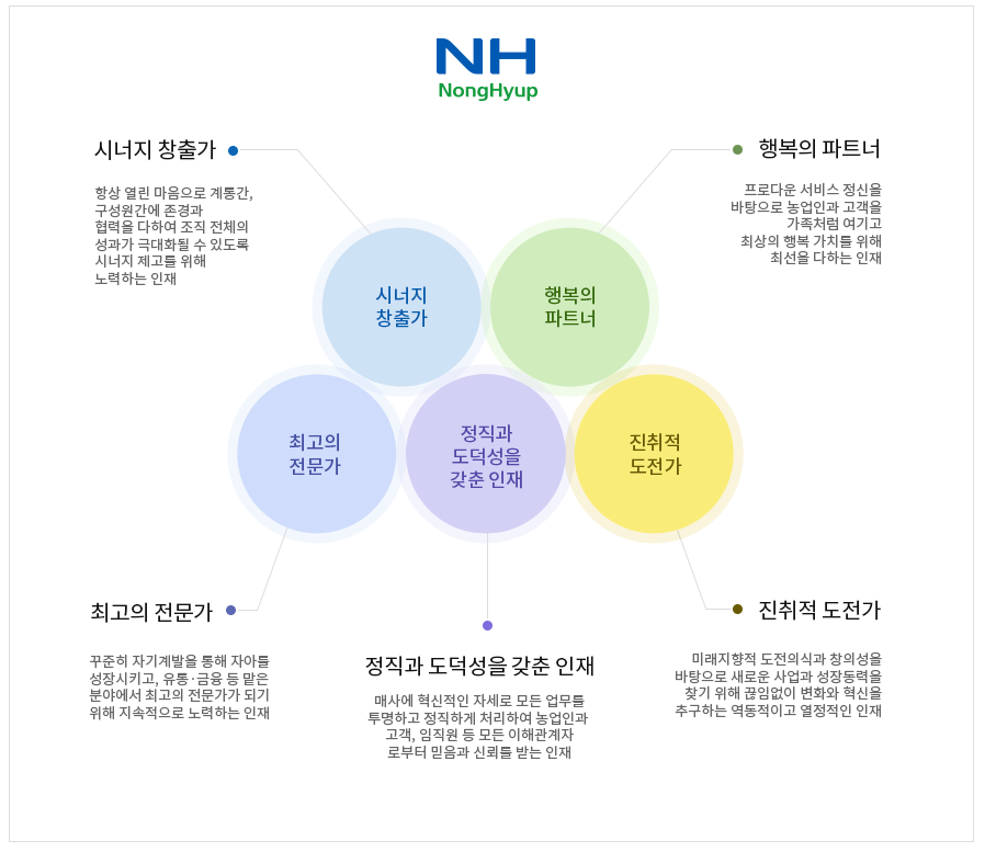 농협의 여러 가지 인재상 중 자신과 가장 적합한 인재상을 하나 선택 후 해당 인재상이 의미하는 것이 무엇인지를 파악합니다.