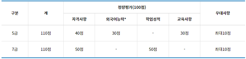 · 정량평가(100%) : 5급(자격사항, 외국어능력, 교육사항), 7급(자격사항, 학업성적)