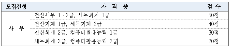 ※자격사항은 5급(40점), 7급(50점) 만점으로 하며, 공통 1개(5급만 해당)와 모집 전형별 자격증 중 점수가 높은 자격증 및 모집전형별 자격증 중 높은 점수 자격증 1개만 인정