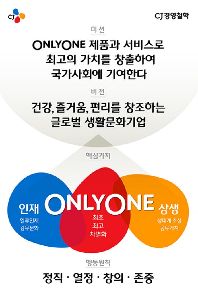 지문에 나와 있는 것처럼 'CJ ONLYONE'에 대한 기본적인 개념 이해를 통해 자신이 생각하는 'ONLYONE'은 무엇인지를 설명하고 이를 뒷받침 할 수 있는 사례 제시