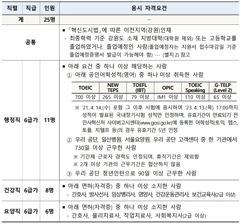 -채용인원 : 407명(일반 302명, 장애 40명, 보훈 40명, 강원인재 25명)