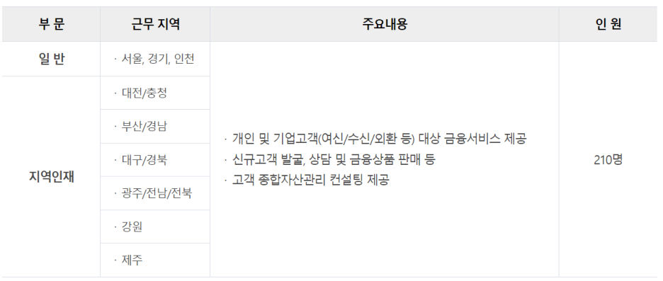 · 경영지원직군 : 전행 차원의 전략 개발, 경영지원, 영업점 업무지원 등과 관련한 직무 수행