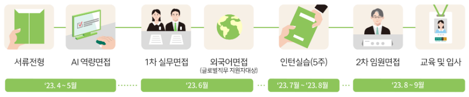 ※ 글로벌 직무 지원자의 경우 1차 면접 이후 별도의 외국어 면접을 추가진행하며, 채용 일정은 회사 사정에 따라 달라질 수 있습니다.