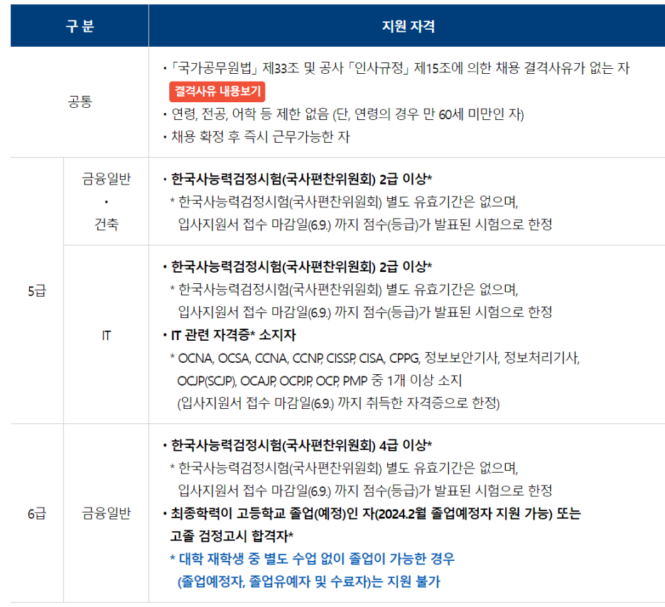 구 분 지원 자격 공통 ㆍ「국가공무원법」 제33조 및 공사 「인사규정」 제15조에 의한 채용 결격사유가 없는 자 결격사유 내용보기 ㆍ연령, 전공, 어학 등 제한 없음 (단, 연령의 경우 만 60세