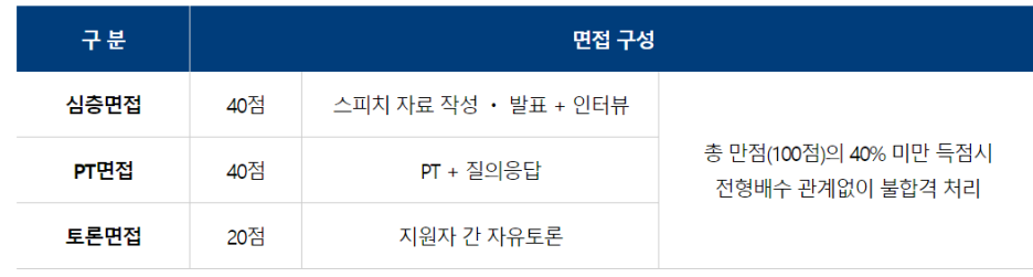 -심층면접 : 스피치 자료(주제 제시) 작성 및 발표, 지원자의 학습 및 경험 등에 대한 인터뷰를 통해 직무/책임, 대인이해, 공직윤리 등을 검증