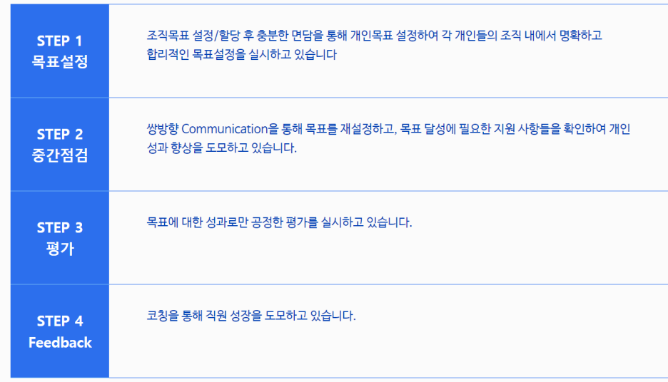 -성과에 따른 적절한 보상과 직원 역량의 향상을 위해 공정하고 객관적인 평가 진행