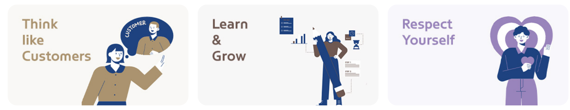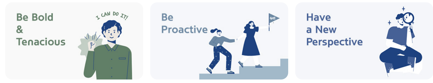 | 담대함 & 집념 그럼에도 불구하고 한번 해볼까? 우리는 대담하므로 실패가 두렵지 않고 실패를 인정할 수 있습니다. 우리에게 '적당히'란 없으며 더 끈질기게 파고들어 탁월한 결과를 만듭니다. |