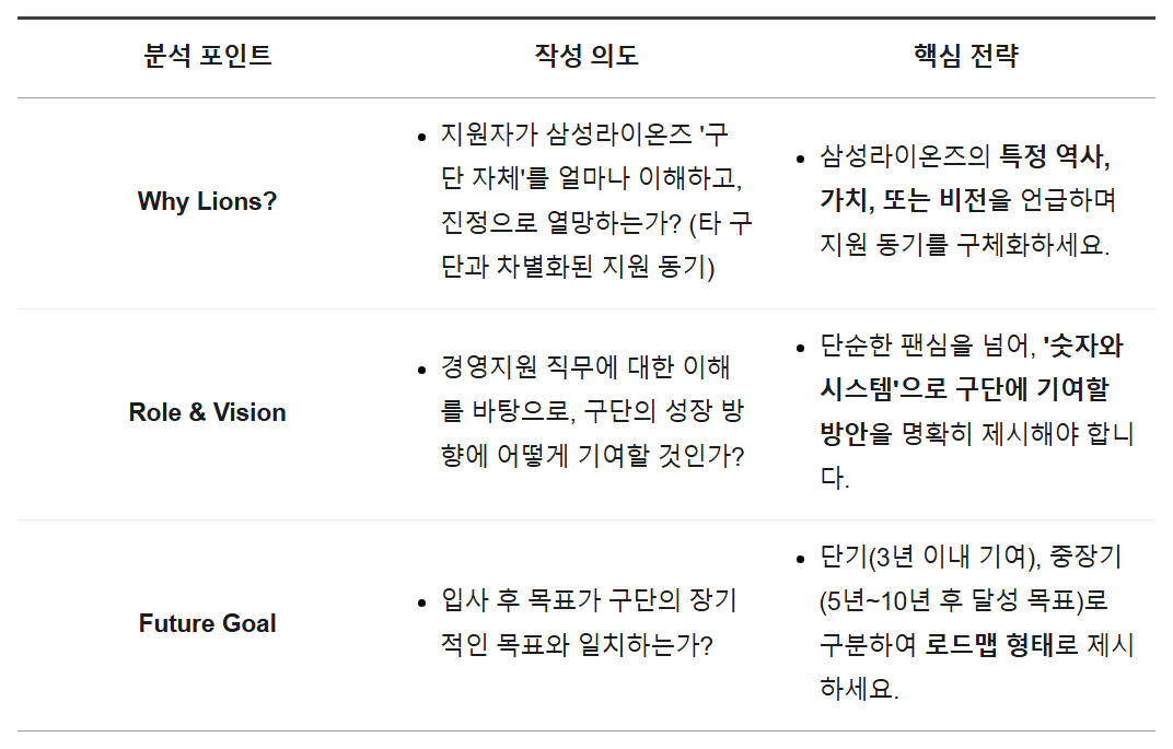 삼성 그룹 인재상 연관성: 라이온즈는 삼성 그룹의 일원입니다. 삼성의 핵심 가치(인재 제일, 상생 경영 등)를 은연중에 녹여내면 긍정적인 평가를 받을 수 있습니다.